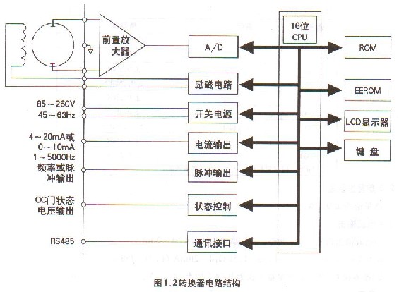 自來水電磁流量轉(zhuǎn)換器一方面向電磁流量傳感器勵(lì)磁線圈提供穩(wěn)定的勵(lì)磁電流,以達(dá)到B是個(gè)常量;同時(shí)把轉(zhuǎn)換器感應(yīng)的電動(dòng)勢(shì)放大、轉(zhuǎn)換成標(biāo)準(zhǔn)的電流信號(hào)或頻率信號(hào),便于流量的顯示、控制與調(diào)節(jié)。圖1.2所示為轉(zhuǎn)換器電路結(jié)構(gòu)。