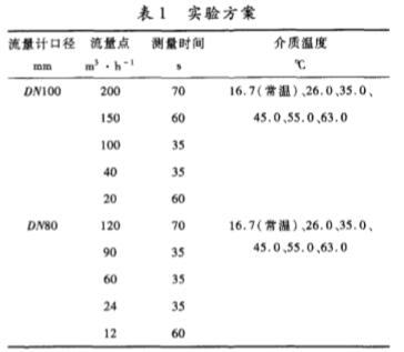 為實(shí)驗(yàn)介質(zhì),選取DN80mm和DN100mm的0.5級電磁流量計(jì),每個(gè)測試點(diǎn)測量3次,共180次測試,研究電磁流量計(jì)特征系數(shù)隨溫度變化的特性。具體實(shí)驗(yàn)方案見表1。