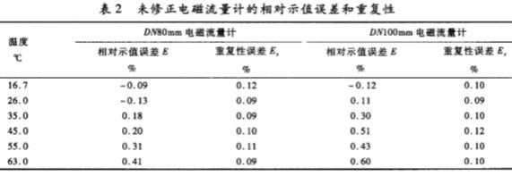 根據(jù)JJG1033—2007,DN80mm和DN100mm電磁流量計(jì)在不同溫度下的相對示值誤差和重復(fù)性見表2??梢钥闯?,當(dāng)流體溫度在16.7—30.0℃時(shí),電磁流量計(jì)的相對示值誤差在40.13%以內(nèi),筆者認(rèn)為在此溫度范圍內(nèi),介質(zhì)溫度變化對電磁流量計(jì)的影響可以忽略。當(dāng)流體溫度在30~63℃時(shí),電磁流量計(jì)的相對示值誤差正差偏,*大誤差為0.60%,對于DN100mm的電磁流量計(jì),其相對示值誤差已經(jīng)超出了0.5級電磁流量計(jì)的精度范圍。因此,當(dāng)電磁流量計(jì)用于高溫環(huán)境的高精度測量時(shí),介質(zhì)溫度的影響-定不能忽略。