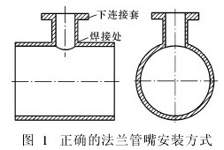 在管道開孔安裝取壓短管時,焊接取壓短管應(yīng)注意垂直方向,要求焊接后短管軸線與管道軸線夾角為90b,且法蘭短管連接的延長線垂直通過管道橫截面的圓心,這樣能保證流體與磁場垂直,見圖1