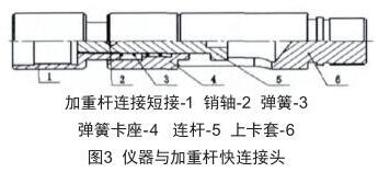 (3)研制的儀器與加重桿快連接頭,把原一體化連接結(jié)構(gòu),改為分體結(jié)構(gòu),儀器在井口防噴裝置內(nèi)放入、取出方便,在保證儀器整體長度大體不變的情況下,降低了操作工人把儀器放入、取出井口防噴裝置的上舉高度,降低了在井口操作時存在的安全風險。