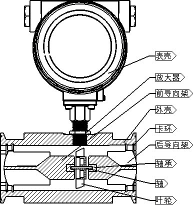 圖所示為渦輪流量傳感器結(jié)構(gòu)簡(jiǎn)圖,由圖可見(jiàn),當(dāng)被測(cè)流體流過(guò)傳感器時(shí),在流體作用下,葉輪受力旋轉(zhuǎn),其轉(zhuǎn)速與管道平均流速成正比,葉輪的轉(zhuǎn)動(dòng)周期地改變磁電轉(zhuǎn)換器的磁阻值。檢測(cè)線圈中的磁通隨之發(fā)生周期性變化,產(chǎn)生周期性的感應(yīng)電勢(shì),即電脈沖信號(hào),經(jīng)放大器放大后,送至顯示儀表顯示。