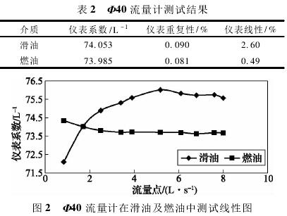 依據(jù)表1測(cè)試數(shù)據(jù),經(jīng)計(jì)算可得,Φ40流量計(jì)在滑油及燃油中測(cè)試結(jié)果如表2所示,測(cè)試線(xiàn)形圖如圖2所示。