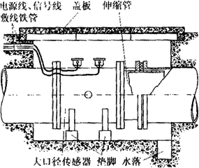 由于大口徑管道在多數(shù)場合下是埋在地下的,因此大口徑傳感器在安裝前應(yīng)做好水泥地坑。圖6-19所示是在給排水系統(tǒng)中常見的安裝形式。水泥地坑應(yīng)有足夠的活動(dòng)空間,側(cè)壁埋有敷設(shè)電纜的鋼管,上有蓋板防止雨淋,下有泄水管以免坑內(nèi)積水而使傳感器侵水。為了拆裝方便,傳感器應(yīng)放在墊腳上,且在下游側(cè)裝有活絡(luò)的伸縮管。圖6-20是智能型防腐電磁流量計(jì)在地下水泥管污水排放系統(tǒng)中的安裝實(shí)例。