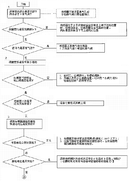 檢查流程圖*5項(xiàng)。信號回路絕緣下降會(huì)形成零點(diǎn)不穩(wěn)。信號回路絕緣下降的土要原因足,包*部位絕緣下降所引起的,但也不能排除信號電纜及其接線端子絕緣下降或破壞。因?yàn)橛袝r(shí)候現(xiàn)場環(huán)境十分嚴(yán)酷,稍一疏忽儀表蓋、導(dǎo)線連接處密封不慎,彌漫著潮氣酸霧或粉粒塵埃侵入儀表接線盒或電纜保護(hù)層,使絕緣卜降。信號回路絕緣電阻檢查分別按電纜側(cè)和流量傳感器側(cè)兩郵分進(jìn)行,用兆歐表測試。因信號電纜容易可先做。流量傳感器再分兩次進(jìn)行:充滿液體測黽電*表面接觸電阻和個(gè)管后測量,U*絕緣電阻。