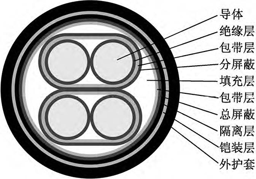 該新型電纜的結(jié)構(gòu)如圖1所示。導(dǎo)體為單股退火鍍錫軟銅線,以提高導(dǎo)體的導(dǎo)電性和防腐蝕性。在導(dǎo)體外繞包一層?。疲矗ň鬯姆蚁┌雽?dǎo)電帶,有利于降低導(dǎo)體和絕緣之間的摩擦起電噪音。絕緣采用材料較為純凈、介電常數(shù)較小、具有一定彈性的聚丙烯絕緣級材料,并采用擠壓式擠出,減小絕緣層與導(dǎo)體的間隙。采用對絞組作為信號傳輸線,由于在兩根傳輸線上感應(yīng)的電壓接近相等,減小了電壓差值,提高了信號傳輸穩(wěn)定性;對絞組由兩種不同顏色絕緣線芯組成,相鄰線對對絞節(jié)距應(yīng)不大于100mm。對絞分屏蔽組(即對對絞組進(jìn)行分屏蔽,每對對絞組外繞包兩層聚酯帶和一層厚0.04mm鋁塑復(fù)合帶繞包,內(nèi)置一根7×0.26mm鍍錫銅絞線作引流線)有利于對不同對絞組之間信號串音的抑制和隔離。對絞分屏蔽組同心式絞合成纜,在對絞分屏蔽組間填充非吸濕性材料,以保證纜芯圓整。在成纜纜芯外繞包兩層聚酯帶,再采用鋁塑復(fù)合帶繞包,內(nèi)置鍍錫銅線作引流線,以提高電纜電磁屏蔽能力??偲帘螌油鈹D包隔離層(隔離護(hù)套),隔離層采用絕緣級低密度聚乙烯材料。隔離層外采用鎧裝層,鎧裝材料為高導(dǎo)磁合金鋼帶,其為強磁材料,可將外來的磁通大部分限制在鎧裝層的外表面上(僅有少部分能進(jìn)入被屏蔽的空間);鎧裝時對高導(dǎo)磁合金鋼帶采用縱包焊接,確保其形成一連續(xù)圓柱管;鎧裝層可提高電纜抗電磁干擾水平以及對電纜進(jìn)行加強,減少電纜振動引起的電動勢。外護(hù)套采用藍(lán)色軟PVC(聚氯乙烯)護(hù)層級電纜材料擠包,實現(xiàn)電纜防護(hù)。