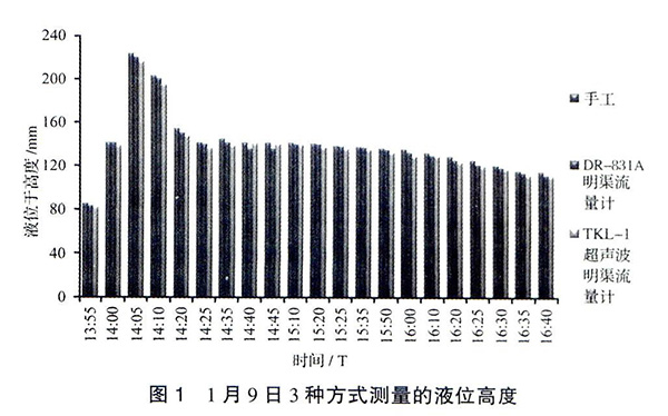 見圖3,以手工實測液位高度為基準(zhǔn),2種流量計的誤差均在±5%的范圍內(nèi)。除在1月9日14∶40和14∶45兩個時間點測量值表現(xiàn)出DR-831A測量誤差高于TKL-Ⅰ外,其他時段都明顯表現(xiàn)出DR-831A測量誤差小于TKL-Ⅰ。