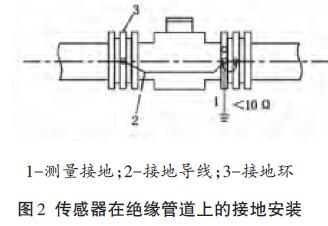 傳感器安裝在塑料管道或內(nèi)壁有絕緣涂層、襯里的管道上,兩端應(yīng)安裝接地環(huán)(或帶有接地電*的金屬短管),然后用導(dǎo)線連接,使管內(nèi)流動的介質(zhì)與大地短路,具有零電位(見圖2)。