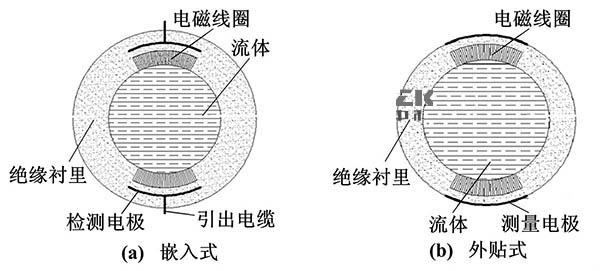 電容式化工原料流量計(jì)從根本上解決了電*表面附著、腐蝕、摩擦等問題,其電*與被測流體間有絕緣襯里隔離,或者直接采用絕緣測量管。電*置于測量管外面或鑲嵌于測量管內(nèi)部。嵌人式化工原料流量計(jì)和外貼式化工原料流量計(jì)的結(jié)構(gòu)如圖2所示。