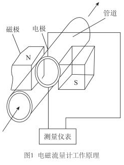 廢水流量表是應用電磁感應定律,即:導電體在磁場中運動產生感應電動勢,而感應電動勢又和流量大小成正比,通過測電動勢來反映管道流量的原理而制成的,用來測量導電流體的體積流量(見圖1)。工業(yè)上多用以測量水、礦漿、各種酸、堿、鹽等腐蝕液體等介質的流量。