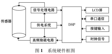 高頻勵磁電鍍廢水流量表由傳感器、高頻勵磁電路、信號處理電路等組成,其中高頻勵磁電路決定著傳感器磁場的強(qiáng)弱,勵磁電路的穩(wěn)定性以及精確性決定著系統(tǒng)檢測的準(zhǔn)確性以及穩(wěn)定性。DSP 系統(tǒng)控制勵磁電路激勵傳感器線圈,當(dāng)線圈中有導(dǎo)電液體流過時,其切割磁感線并在傳感器兩端的線圈上產(chǎn)生感應(yīng)電動勢,利用信號檢測電路監(jiān)測感應(yīng)電動勢的大小,*后根據(jù)相應(yīng)關(guān)系計算出液體的流量,系統(tǒng)硬件框圖如圖 1 所示。