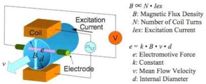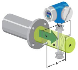補(bǔ)水流量計(jì)使用法拉*電磁感應(yīng)定律進(jìn)行流量測(cè)量。法拉*定律指出,每當(dāng)長(zhǎng)度為“ l”的導(dǎo)體以垂直于磁場(chǎng)“B”的速度“v”運(yùn)動(dòng)時(shí),就會(huì)在相互垂直的方向上感應(yīng)出電動(dòng)勢(shì)“e”,其方向?yàn)?br/>e = Blv……(eq1)