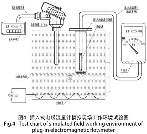 其原因是:勵磁線圈的阻值及匝數(shù)是按照常溫狀態(tài)下進(jìn)行設(shè)計的,而含有勵磁線圈的鹽酸流量表經(jīng)常是高于常溫狀態(tài)下進(jìn)行安裝、使用(如:高爐回水、供熱管道等),勵磁線圈的阻值隨使用環(huán)境溫度的變化而變化,致使鹽酸流量表測量時的準(zhǔn)確度大為降低,性能的不確定性大為增加,為了保證儀表的高準(zhǔn)確度和穩(wěn)定性,在不同的季節(jié)(主要是環(huán)境溫度和介質(zhì)溫度),經(jīng)過大量模擬現(xiàn)場實際情況的試驗,并結(jié)合轉(zhuǎn)換器的技術(shù)參數(shù)要求,得出一個完善的勵磁線圈各種技術(shù)參數(shù)。模擬現(xiàn)場試驗裝置如圖 4 所示。