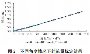 為了考察井眼斜度變化對(duì)原水流量計(jì)測(cè)量流量的影響,開(kāi)展了非集流原水流量計(jì)在不同斜度情況下的流量測(cè)量模擬實(shí)驗(yàn)。模擬實(shí)驗(yàn)在大慶油田多相流實(shí)驗(yàn)室進(jìn)行,儀器外徑 38 mm,模擬井筒內(nèi)徑為 124 mm,實(shí)驗(yàn)介質(zhì)是水,傾斜角度分別為 0°、40°、80°和 90°( 水平) ,流量范圍為 5 ~ 850 m3 /d。實(shí)驗(yàn)結(jié)果表明,在儀器居中條件下,井眼斜度變化對(duì)原水流量計(jì)的儀表常數(shù)沒(méi)有影響,滿量程誤差不大于 4% ,因此可以應(yīng)用原水流量計(jì)進(jìn)行水平井注水剖面測(cè)量。不同角度情況下的實(shí)驗(yàn)結(jié)果如圖 2 所示。