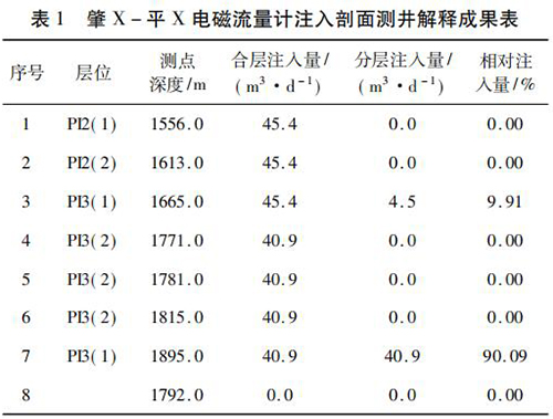 2017 年 9 月在大慶油田采油八廠肇 X - 平 X 水平井注水井中*次進(jìn)行了水平井注入剖面測(cè)井現(xiàn)場(chǎng)試驗(yàn)。該井斜深2 055. 42 m,水平段長(zhǎng)度為568. 46 m,試驗(yàn)?zāi)康氖峭ㄟ^(guò)注入剖面測(cè)井了解該井各層段的注水情況,同時(shí)對(duì)水平井測(cè)井工藝、儀器的適用性、井下?tīng)恳骷熬谳o助裝置等設(shè)備的工作有效性和可靠性進(jìn)行評(píng)價(jià)?,F(xiàn)場(chǎng)試驗(yàn)中,在密閉條件下錄取到了該井的注入剖面測(cè)井資料,進(jìn)行了重復(fù)測(cè)量,重復(fù)測(cè)量結(jié)果在誤差允許范圍內(nèi),測(cè)井成果見(jiàn)表 1。該井施工壓力 6. 0 MPa,注入量45. 4 m3 /d,有 7 個(gè)射孔層,分 8 個(gè)測(cè)點(diǎn)測(cè)量,2 個(gè)層有吸入顯示,其中,P13( 1) ( 1 734 ~ 1 767 m) 層絕對(duì)吸入量4. 5 m3 /d,相對(duì)吸入量為9. 91 %,P13( 1) ( 1 899 ~1 943 m)層絕對(duì)吸入量 40. 9 m3 /d,相對(duì)吸入量為 90. 09% ,測(cè)井成果見(jiàn)表 1。通過(guò)與甲方的交流,再結(jié)合該井的動(dòng)靜態(tài)資料及周?chē)墓ぷ鳡顩r,采油廠的地質(zhì)人員認(rèn)為本次測(cè)井結(jié)果能比較準(zhǔn)確地反映該井的注入情況。