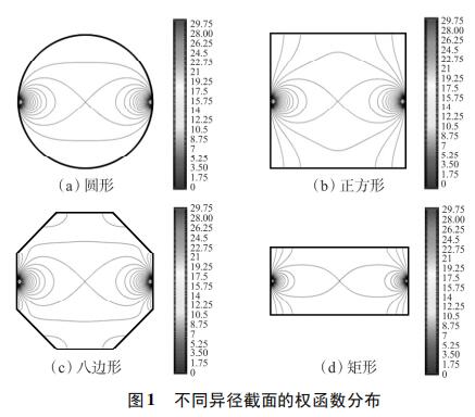 為考察不同異徑截面權(quán)函數(shù)分布的均勻性,使用上述方法對圓形、正方形、八邊形和矩形異徑截面的權(quán)函數(shù)分布進(jìn)行定性分析。為了便于對比,設(shè)置管道口徑為DN100,異徑部分截面積為3200mm2。所以,圓形異徑面半徑為32mm,正方形異徑面邊長為56.6mm,八邊形異徑面邊長為25.8mm,矩形異徑面長寬為80×40mm。仿真結(jié)果如圖1所示,為了便于對比,權(quán)函數(shù)等勢線大小從0開始,以0.25為步長遞增到30。由圖1(a)~圖1(d)可知,矩形異徑截面的權(quán)函數(shù)等勢線間距*大,即權(quán)函數(shù)變化梯度*小,權(quán)函數(shù)分布*均勻。