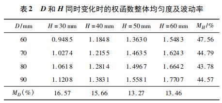 根據(jù)表 1 和表 2 權(quán)函數(shù)均勻度的波動率數(shù)值可以看出,MH > MD > ML,所以,矩形段 L,D,H 對于權(quán)函數(shù)均勻度的影響程度是依次增強的,高度 H 對權(quán)函數(shù)均勻度影響*大,寬度 D 影響稍小,長度 L 影響很小。且 D 和 H 越小,權(quán)函數(shù)整體均勻度 R 越小,權(quán)函數(shù)分布越均勻。