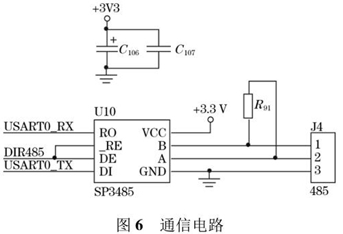 智能分體式電磁流量計(jì)輸出的流量值可以通過(guò)外接的 TFTLCD 屏直接顯示,還可以通過(guò)預(yù)留的 RS485 通信接口將數(shù)據(jù)發(fā)送到上位機(jī)中。RS485 電路*大的優(yōu)點(diǎn)是 485 電平與 TTL 電平兼容,方便與 TTL 電路相連;抗共模干擾能力強(qiáng);數(shù)據(jù)傳輸速度快,高達(dá) 10 Mbps;通信距離遠(yuǎn),*大為 1.2 km。系統(tǒng)采用 SP3485 芯片進(jìn)行數(shù)據(jù)通信,SP3485 是一款低功耗芯片且符合RS485 協(xié)議的收發(fā)器,電路圖如圖 6 所示。