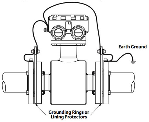 3.具體的連接:接地環(huán)或襯里保護(hù)器應(yīng)如圖5所示進(jìn)行連接。將兩個(gè)接地環(huán)都連接到傳感器外殼上以使流過(guò)電*附近的過(guò)程流體的電流*小化非常重要。