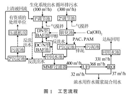 2種廢水在中間水池混勻后,通過(guò)泵提升進(jìn)入保安過(guò)濾器,進(jìn)一步去除細(xì)小的懸浮物后經(jīng)過(guò)增壓泵進(jìn)入超濾膜(UF)處理系統(tǒng)和反滲透(RO)系統(tǒng),然后通過(guò)dn50氨水流量計(jì)進(jìn)行計(jì)量。反滲透出水直接進(jìn)入回用水池達(dá)標(biāo)回用,超濾濃水以及反滲透濃水用作水煤漿混合用水。污泥池中的污泥通過(guò)泵打入帶式機(jī)壓濾處理,濾液自流進(jìn)入1#調(diào)節(jié)池。工藝流程見(jiàn)圖1。