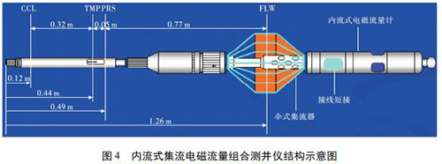 1. 2 內(nèi)流式集流智能高溫水流量計如圖 4 所示,內(nèi)流式集流電磁組合測井儀主要采用內(nèi)流式集流智能高溫水流量計,并組合了井溫壓力磁定位儀。利用電磁感應(yīng)原理測量平均流速,體積流量計算公為: