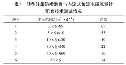 在實際應(yīng)用中,使用輕型注脂防噴裝置與內(nèi)流式集流智能高溫水流量計配套技術(shù)對喇叭口在射孔層上注聚井進行測試。輕型注脂防噴裝置與內(nèi)流式集流智能高溫水流量計配套技術(shù)施工工藝參見文獻,測試情況見表 1 所示,低注入量井( ≤10 m3 /d) 占到 56. 60% 。