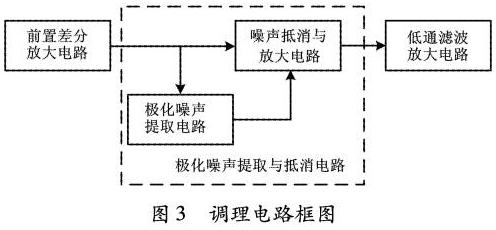 根據(jù)前饋控制的自適應(yīng)*化噪聲抵消原理,設(shè)計了信號調(diào)理電路2,以實現(xiàn)*化噪聲的濾除。信號調(diào)理電路2主要包括前置差分放大電路、*化噪聲提取與抵消電路、低通濾波放大電路三部分。調(diào)理電路如圖3所示。