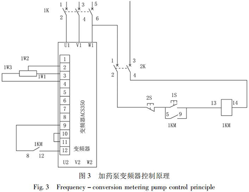 STD - Ⅲ型浮選工藝參數(shù)自動測控系統(tǒng)通過雙膜盒差壓計測量原礦漿濃度; 采用鹽水流量計測量原礦漿流量,由 PLC 計算出入浮干煤泥量和藥劑的瞬時添加量,用變頻式計量泵完成浮選藥劑的添加。通過上位機還可以打印小時、班、天及月的運行數(shù)據(jù),更加有利于生產(chǎn)管理及技術(shù)分析,藥劑自動原理如圖 2 所示,k1、k2、k3 是計算修正參數(shù)。以 PID 算法為核心,通過優(yōu)化控制程序計算出藥劑給定量,在捕收劑和起泡劑管道上分別安裝藥劑測量裝置,用于檢測藥劑的添加量。當藥劑測量值小于藥劑給定量時,PID 輸出增大,反之則減小。加藥泵變頻器控制原理如圖 3 所示。