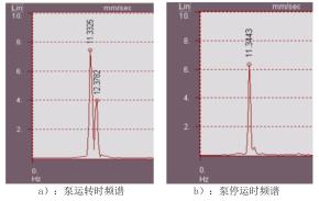 對(duì)振動(dòng)采集器獲取的信號(hào)進(jìn)行譜分析,河水流量計(jì)組運(yùn)轉(zhuǎn)狀態(tài)下主要振動(dòng)頻率為11.33Hz和12.38Hz,其中12.38Hz為液體流量計(jì)轉(zhuǎn)動(dòng)頻率;停運(yùn)時(shí),12.38Hz的液體流量計(jì)轉(zhuǎn)頻消失,11.33Hz的外部激擾力依然存在。