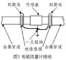 (4)盡量避開振動(dòng)源、磁源(大功率電機(jī)、變壓器)由于管道水流量表的測量感應(yīng)電壓很小,電壓較低,易受外界電磁噪聲的影響,故在安裝時(shí)應(yīng)進(jìn)行可靠的接地連(跨)接。金屬管道管道水流量表接地連(跨)接方法如圖3所示