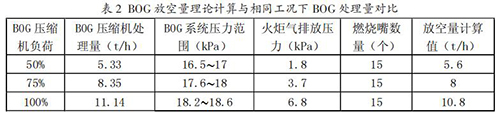 為維持 BOG 系統(tǒng)壓力穩(wěn)定,在正常工況下通過 BOG壓縮機(jī)回收 BOG 方式進(jìn)行,在檢修期間采用火炬放空方式進(jìn)行。從表 2 中可以看出,在系統(tǒng)壓力維持一定值時,理論計算值與 BOG 壓縮機(jī)處理量基本相同,火炬氣放空量 計算方法可行。