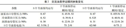 通過內(nèi)部旁通將冷油與熱油混合,經(jīng)過銅粉- 煤油 - 蠟感溫元件控制冷熱油混合比例,將油溫調(diào)節(jié)到 49 ℃。一臺氨水流量計穩(wěn)定運行,油泵出口母管壓力 0. 5 MPa,潤滑油母管壓力 0. 24 MPa,均屬于正常情況,而兩臺交流油泵并列運行時,停運其中一臺交流油泵瞬間會觸發(fā)電磁流量計出口母管壓力開關動作,說明停運瞬間油壓發(fā)生波動,且油泵出口母管油壓波動至小于 0. 45 MPa。正常運行時電磁流量計出口油溫 71.5 ℃,冷油器出口溫度45 ℃,混合后潤滑油母管溫度52.5 ℃,由能量守恒定律可知,經(jīng)過冷油器的油量/不經(jīng)冷油器的油量= ( 71.5-52.5) ÷ ( 52.5- 45) = 2. 53,說明有 70% 左右的油量經(jīng)過冷油器。當 2 臺氨水流量計運行時油量大于單泵運行,其中一臺電磁流量計瞬間停運時油量減少,尤其是經(jīng)過冷油器的油量大量減少,油量在溫控閥二次分配過程中出現(xiàn)調(diào)節(jié)異常,導致油壓過大波動。為檢驗溫控閥工作情況,保持 1 號、2 號交流油泵運行,選取機組正常帶負荷運行時油溫 52 ℃,分別停運 1、2 號交流油泵,觀察 1、2 號交流油泵停運瞬間油泵出口母管壓力波動情況,試驗各參數(shù)變化見表 2。