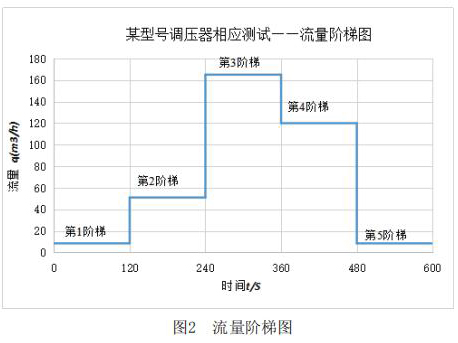 該測試主要利用實(shí)驗(yàn)室測試條件,模擬客戶現(xiàn)場使用情況。其主要測試內(nèi)容包括:測試電磁流量計(jì)在+23℃,-30℃和-40℃三種溫度下,電磁流量計(jì)出口壓力分別在2.1kPa和30kPa時(shí),流量分別從*1階梯到*5階梯時(shí)的響應(yīng)速度,客戶所提供的流量階梯如圖2所示。橫軸表示下游球閥開啟動(dòng)作時(shí)間,縱軸表示循環(huán)水流量計(jì)下游需要的流量q。
