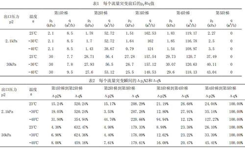 通過實(shí)驗(yàn)室的模擬測試,對于2.1kPa和30kPa出口設(shè)定壓力,分別得到的6條曲線,3條不同溫度下的壓力曲線和3條不同溫度下的流量曲線,如圖4和圖5所示。在*120s、240s和360s時(shí),由于流量突然增加,造成出口壓力瞬時(shí)降低。在*480s時(shí),由于流量突然減小,造成出口壓力瞬時(shí)升高。圖中的橫軸表示球閥的動(dòng)作響應(yīng)時(shí)間,*一縱軸對應(yīng)電磁流量計(jì)出口壓力p2,*二縱軸表示電磁流量計(jì)對應(yīng)該出口壓力下流量q。