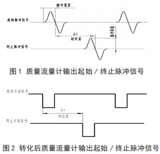 將循環(huán)水流量計流量與相關(guān)測試設(shè)備連接起來,就可以進行循環(huán)水流量計的校準,時間差△ t 由專用試驗測試設(shè)備可以測出。起始脈沖信號和終止脈沖信號如圖 1 所示。經(jīng)過專用試驗測試設(shè)備信號轉(zhuǎn)化后的信號方波如圖 2 所示。