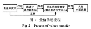 江都泵站曾按ISO標(biāo)準(zhǔn)規(guī)定位置布置26臺流速計(jì),測量大型水泵3.5m×1.5m矩形出水流道平均流速,以校準(zhǔn)用差壓法測量泵進(jìn)水道差壓的流出系數(shù),測量流速在1.2~1.3m/s之間。期間還用食鹽濃度法校準(zhǔn)流速計(jì)面積法,在實(shí)驗(yàn)過程中再用食鹽濃度法復(fù)核流速計(jì)面積法的數(shù)據(jù)。量值傳遞流程如圖2所示。