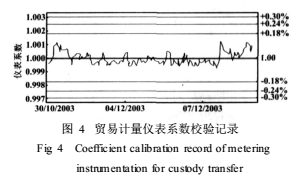 兩臺儀表中一臺日常貿(mào)易交接計(jì)量儀表由另一臺參比表(master meter)核查和校驗(yàn)。圖4所示是貿(mào)易計(jì)量儀表流量在4000~5500m³/h時(shí)的校驗(yàn)記錄,變化在原校準(zhǔn)儀表系數(shù)的±0.180%范圍內(nèi),*大變化為0.090%,標(biāo)準(zhǔn)偏差為0.045%。