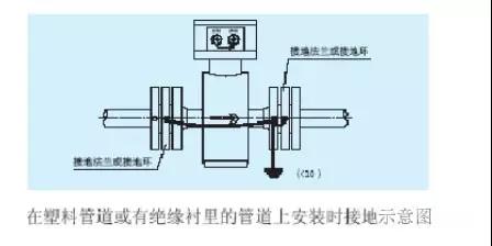 b.傳感器在塑料管道上或在有絕緣襯里的管道上安裝,傳感器的兩端應(yīng)安裝接地環(huán)、或接地法蘭、或帶有接地電*的短管,按下圖接地。使管內(nèi)流動的被測介質(zhì)與大地短路,具有零電位,否則,污水計量表無法正常工作。