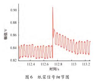 為了進(jìn)一步研究水煤漿信號(hào)的特點(diǎn),將其與紙漿信號(hào)進(jìn)行對(duì)比。通過(guò)分析課題組采集的25Hz矩形波勵(lì)磁下的紙漿信號(hào)發(fā)現(xiàn),在同樣流速下,測(cè)量介質(zhì)為紙漿時(shí),傳感器輸出信號(hào)經(jīng)調(diào)理放大后能明顯看到與流量相關(guān)的感應(yīng)電動(dòng)勢(shì)信號(hào),且其漿液干擾僅為數(shù)十毫伏,要遠(yuǎn)小于水煤漿信號(hào)中的漿液干擾,如圖5所示。對(duì)圖5所示的紙漿信號(hào)進(jìn)行局部放大,得到如圖6所示的信號(hào)。可見(jiàn),紙漿信號(hào)中的漿液干擾持續(xù)的時(shí)間也遠(yuǎn)小于水煤漿信號(hào)中的漿液干擾,且頻率較低。
