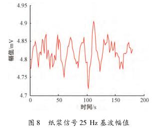 在頻域中對(duì)紙漿信號(hào)觀(guān)察時(shí)發(fā)現(xiàn),紙漿信號(hào)的漿液噪聲頻帶在零頻率點(diǎn)附近,距離流量信號(hào)基波頻率點(diǎn)較遠(yuǎn),對(duì)基波幅值和各奇次諧波幅值基本沒(méi)有影響,紙漿信號(hào)在頻域中的圖形如圖7所示。選擇一組采集的紙漿信號(hào),把其等分成數(shù)段,利用MATLAB計(jì)算每段數(shù)據(jù)在基波處的幅值并提取保存在一個(gè)數(shù)組中,使用繪圖工具畫(huà)出來(lái),如圖8所示。可見(jiàn),基波幅值在4.7~4.95mV變化,波動(dòng)較小。因此,提取到的與流量相關(guān)的感應(yīng)電動(dòng)勢(shì)信號(hào)幅值會(huì)比較穩(wěn)定。