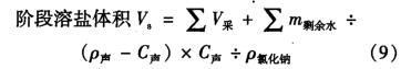 式中:V,為日溶鹽體積,m3; VA為日采鹽體積,m3 ;場(chǎng)余為腔體擴(kuò)大后未排出液體的溶鹽體積,m3 ; Vip1*a為腔體擴(kuò)大后未排出液體體積,m3m剩赫為腔體擴(kuò)大后未排出的液體中等效淡水溶劑質(zhì)量,kg;V排-為日排出液體體積,m3m瑰為日注人液體體積,m3; C排為日排出液體氯化鈉質(zhì)量體積濃度,歲1; C排-為日注人液體氯化鈉質(zhì)量體積濃度,g/l;C注為日排出液體密度,kg/m3 ; p注為日注人液體密度,kg/m3,P氯化鈉為氯化鈉密度,kg/m3 ; p水為水的密度,kg/m3 ; V8為階段溶鹽體積,m3 ; C聲為聲吶測(cè)量時(shí)腔體內(nèi)氯化鈉質(zhì)量體積濃度,g/1; P聲為聲吶測(cè)量時(shí)腔體內(nèi)液體密度,kg/m3kg/M。