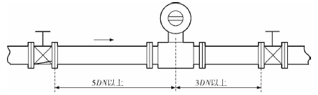 dn65一體式電磁流量計的安裝質(zhì)量對其測量結(jié)果的影響較大,因此在安裝時需要注意幾個問題。*先,dn65一體式電磁流量計直管段的選擇在配管時一定要按照要求進行選擇,一般選擇流量計通徑與工藝管道通徑相同,即可滿足工程需要,而且安裝方便、壓力損失小,流量計直管段上游側(cè)的長度不少于5倍工藝管道直徑,下游側(cè)的長度不少于3倍工藝管道直徑(圖2)。但在流速太慢而又要求精度較高或需要變徑的應用場合,可選擇通徑小于工藝管道通徑的流量計,以提高測量精度,此時流量計上、下游必須加裝異徑管,且進口異徑管上游側(cè)應有長于10倍工藝管道直徑的直管段,下游側(cè)應有長于5倍工藝管道直徑的直管段(圖3)。